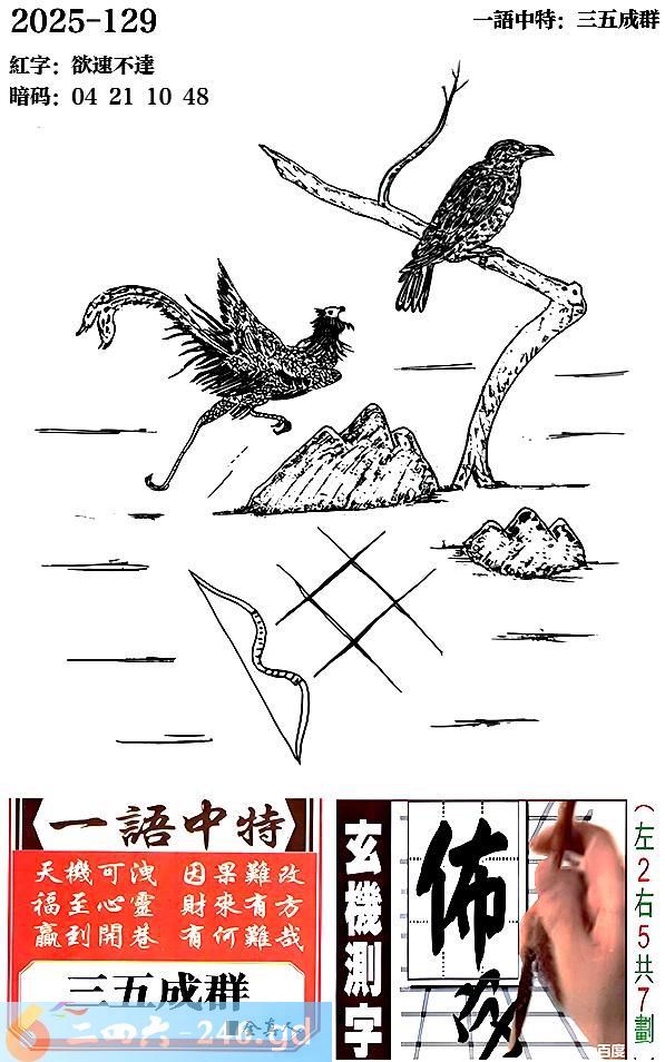 129期跑狗一字記之曰:【阱】 枝上昏鴉,鳳影掠過。 暗阱藏伏,命入絲弦。 玄機測字:《佈》 一語中特:三五成群