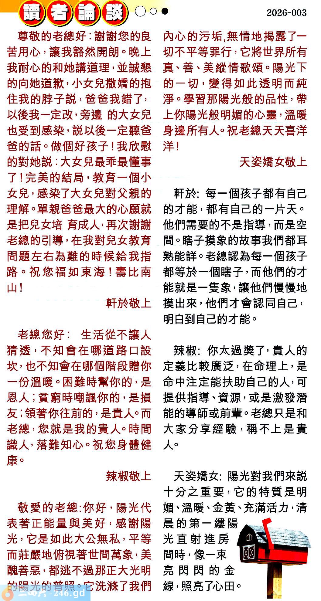 第003期讀者論談 1.尊敬的老總好:謝謝您的良苦用心,讓我豁然開朗。晚上我耐心的和她講道理,並誠懇的向她道歉,小女兒撒嬌的抱住我的脖子説,爸爸我錯了,以後我一定改,旁邊的大女兒也受到感染,説以後一定聽爸爸的話。做個好孩子!我欣慰的對她説:大女兒最乖最懂事了!完美的結局,教育一個小女兒,感染了大女兒對父親的理解。單親爸爸最大的心願就是把兒女培育成人,再次榭謝老總的引導,在我對兒女教育問题左右為難的時候給我指路。祝您福如東海!壽比南山!軒於敬上 〖軒於〗:每一個孩子都有自己的才能,都有自己的一片天。他們需要的不是指導,而是空間。瞎子摸象的故事我們都耳熟能詳。老總認為每一個孩子都等於一個瞎子,而他們的才能就是一隻象,讓他們慢慢地摸出來,他們才會認同自己,明白到自己的才能。 2.老德您好:生活從不讓人猜透,不知會在哪道路口設坎,也不知會在哪個階段贈你一份溫暖。困難時幫你的,是恩人;貫窮時嘲諷你的・是損友;領著你往前的,是貴人。而老總,您就是我的貴人。時間識人,落難知心。祝您身體健康。辣椒敬上 〖辣椒〗:你太過獎了,貴人的定義比較廣泛,在命理上,是命中注定能扶助自己的人,可提供指導、資源,或是激發潜能的導師或前輩。老總只是和大家分享經驗,稱不上是貴人。 3.敬愛的老總:你好,陽光代表著正能量與美好,感謝陽光,它是如此大公無私,平等而莊嚴地俯視著世間萬象,美醜善惡,都逃不過那正大光明的陽光的普照。它洗滌了我們内心的污垢,無情地揭露了一切不平等罪行,它將世界所有真善、美縱情歌頌。陽光下的一切,變得如此透明而純淨。學習那陽光般的品性,帶上你陽光般明媚的心靈,溫暖身邊所有人。祝老總天天喜洋洋!天姿嬌女敬上 〖天姿嬌女〗:陽光對我們來説十分之重要,它的特質是明媚、溫暖、金黄、充滿活力,清晨的第一縷陽光直射進房間時,像一東亮閃閃的金線,照亮了心田。
