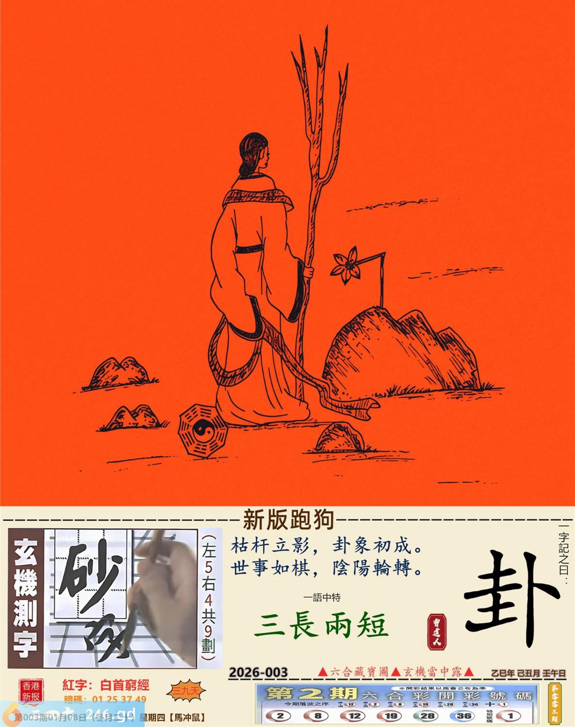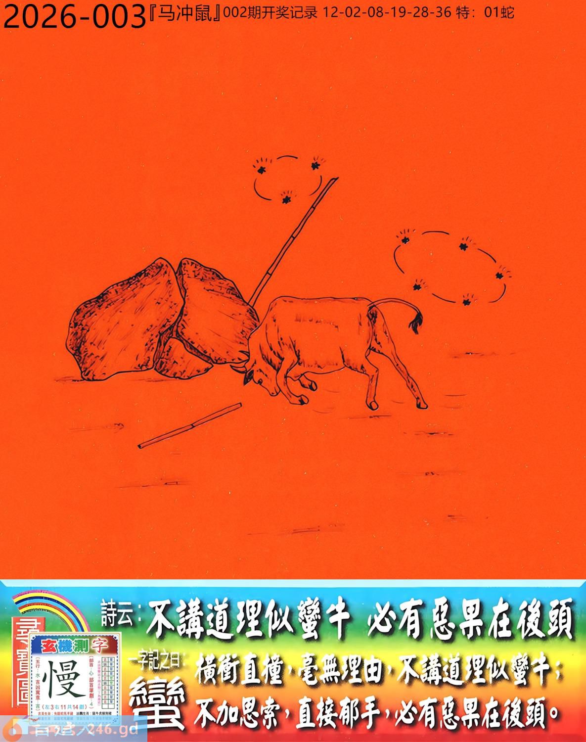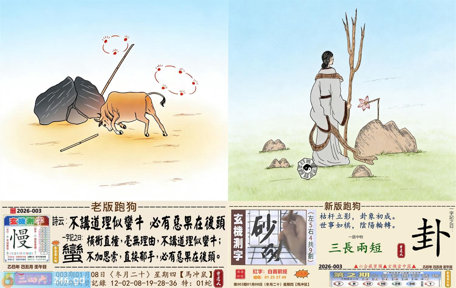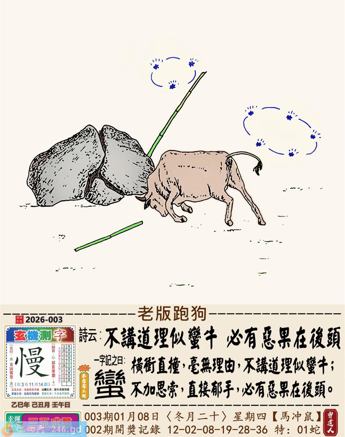 2026年1月8日003期鼠(丙子)(杨柳木) 003期:老版跑狗玄機一字記之曰:【蠻】 詩云:不講道理似蠻牛必有惡果在後頭 橫衝直撞,毫無理由,不講道理似蠻牛; 不加思索,直接郁手,必有惡果在後頭。 玄機測字:《慢》 密圖詩:一二好運伴八在 《記》:三人玩耍最開心 特碼大小單雙句:一山不能容二虎 今期必中:貂禪 003期:特碼歇后語 黑瞎子骑脖领-----熊到头上了 003期正版四字梅花诗:沉默是金。 003期火车头:烧伤羊。诗:牛死兔伤,换梁偷柱为一员。 003期香港第一手欲钱料:风吹草动。 003期曾道人说:“子” 003期另版四字梅花诗:九九归一。 003期香港第一手欲钱料:欲钱找电视机的外壳。 003期曾道人说:“为什么老鼠看见猫会害怕”? 003期:二字經:愛人 003期:头上是特码 003期:智力金壤:风花雪月 003期:信箱紅字:【白首窮經】 003期:【暗碼:01-25-37-49】 003期:一語中特:【三長兩短】 發財玄機圖:大腹便便肥頭大耳圖中明豬紅藍 003期:藏寳圖 新:君今旧隐治叁径 老:交游相见休相问 禁:狗禁:3尾玄机字《队》 2026年003期【生活幽默】版 〖照顧藏獒和鹦鹉〗 一天,老張的鄰居出遠門,要老王照顧好家裹的藏獒和鹦鹉,并且告訴他,藏獒叫老黑,你可以随便逗它玩,但是鹉绝對不能逗它。老王笑着答應了。 之後,老王逗了藏獒好久什事也没有,看到鹦鹉,心想藏獒都逗得起,那衹傻鳥怕什...于是果斷逗了鹦鹉。 鹦鹉説話了:哎我草,撩騷是不?老黑,上!咬他!......随後老王被拉進急救室......