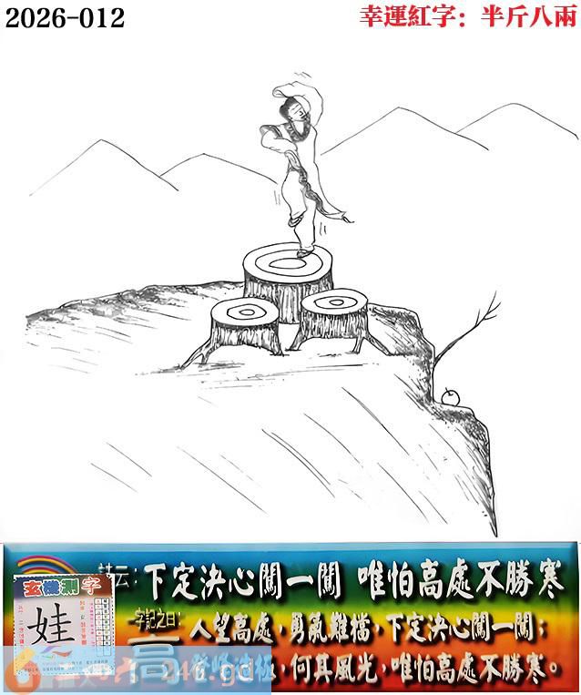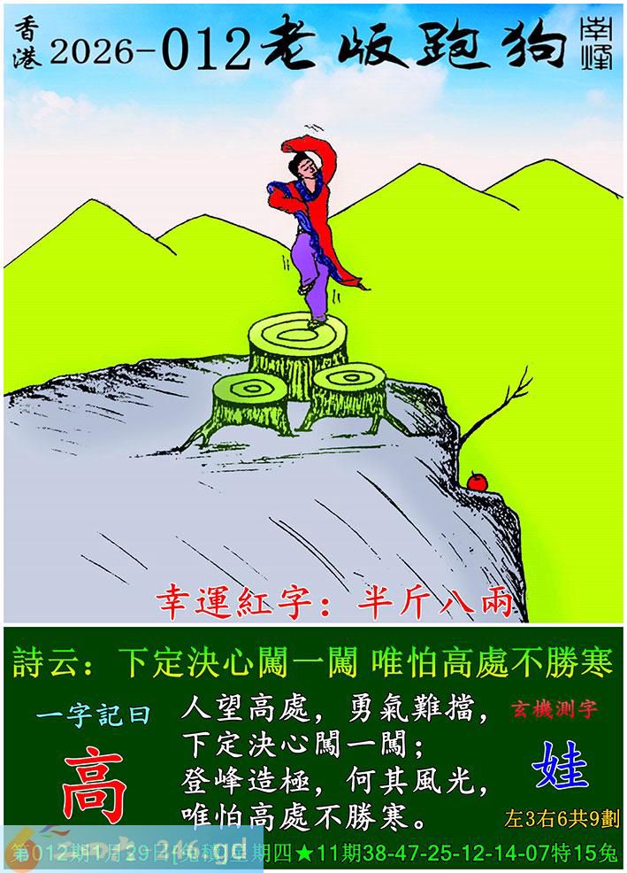 012期老版跑狗一字記之曰:【高】 詩雲:下定決心闖一闖,唯怕高處不勝寒。 人望高處,勇氣難擋,下定決心闖一闖; 登峰造極,何其風光,唯怕高處不勝寒。 玄機測字:《娃》