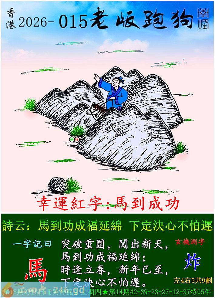 015期老版跑狗一字記之曰:【馬】 詩雲:馬到成功福延綿,下定決心不怕遲。 突破重圍,闖出新天,馬到成功福延綿; 時逢立春,新年已至,下定決心不怕遲。 玄機測字:《炸》