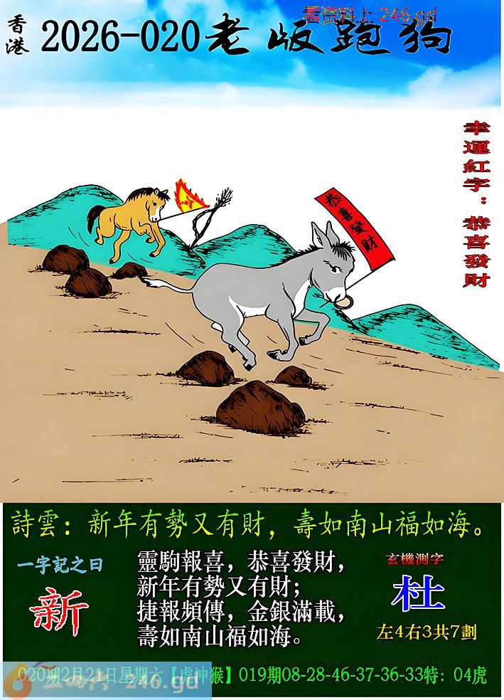 020期老版跑狗一字记之曰:【新】 诗云:新年有势又有财,寿如南山福如海。 灵驹报喜,恭喜发财,新年有势又有财; 捷报频传,金银满载,寿如南山福如海。------- 按常理,新春第一期老鸡都会给大家送福利。单纯看老狗,本期好像亦是如此。风险与机会并存!生肖:【主鼠防虎】号码:【07、19】----- 祝各位新年六仔期期中大奖,天天有好运,人人发大财!