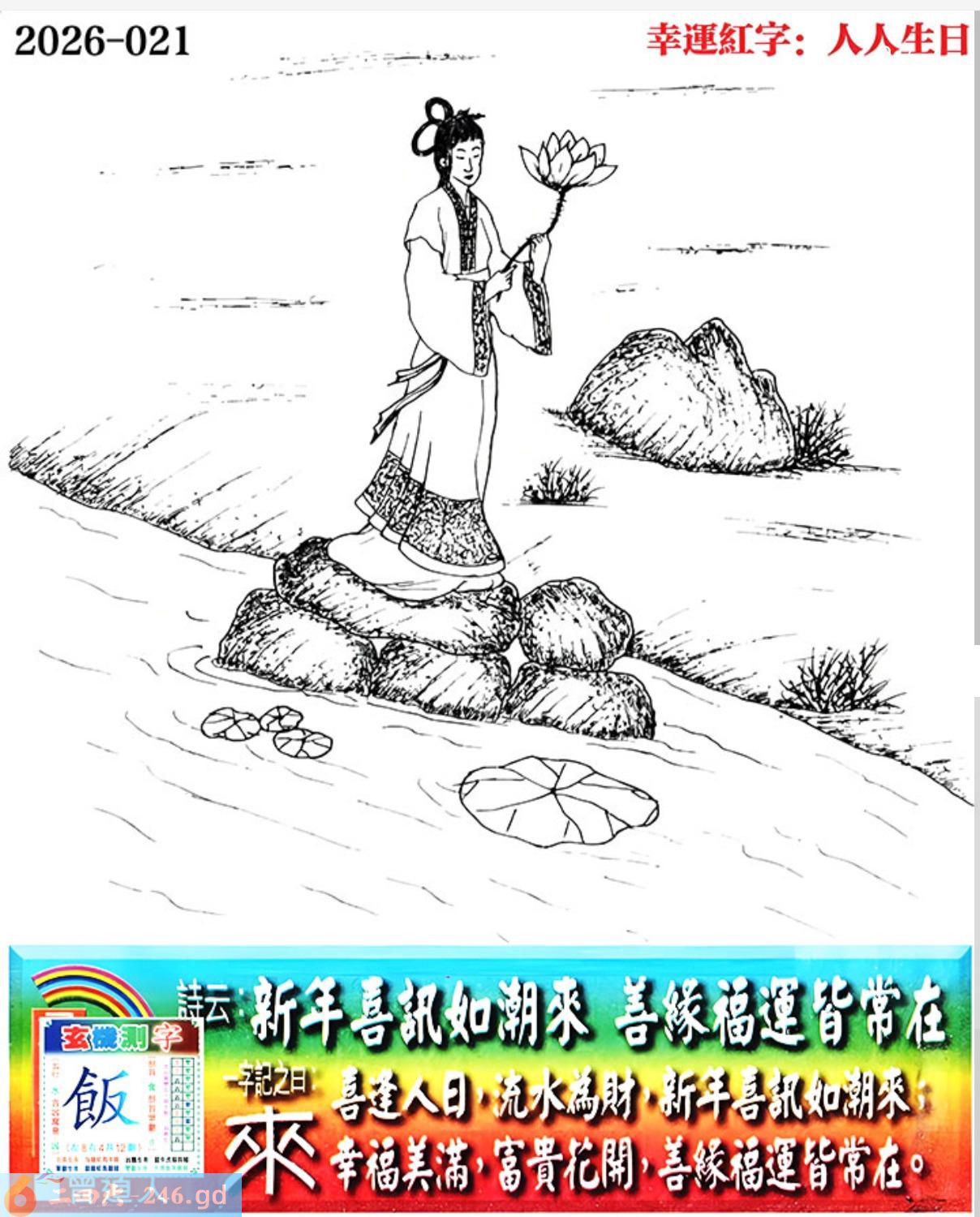 詩雲:新年喜訊如潮來,善緣福運佳皆常在。